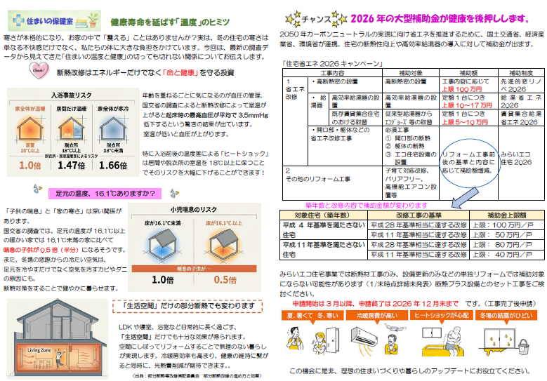 event ニュースレター「かたいけの」2026年2月号 2月号は以下の4つの情報をお届けします! ・施工事例:イッセイホーム社屋トイレ工事 ・住まいの保健室:断熱改修について ・2026年の大型補助金が健康を後押しします ・楽しもう!今年の各地インベント なかでも特に注目なのは… 住まいの保健室のコーナーです。断熱改修をすることで省エネだけではなく、命と健康を守ります。国交省のデータを元に記載しました。ご参考になれば幸いです 一言 健康寿命を延ばす「温度」。断熱改修で健康維持に繋げましょう 備考 ニュースレターは2ヶ月に1度、イッセイホームの施工情報・お得情報・最新のリフォーム情報など、もりだくさんに発行しています。 Application お申し込みはこちらから STEP.1 必要事項の入力 STEP.2 入力内容の確認 STEP.3 お申し込み完了 STEP.1 必要事項の入力 STEP.2 入力内容の確認 STEP.3 お申し込み完了 STEP.1 必要事項の入力 STEP.2 入力内容の確認 STEP.3 お申し込み完了 必須イベント名 必須参加希望日 必須参加人数 必須お名前 必須メールアドレス 任意郵便番号 住所検索 必須住所 任意電話番号 任意お問い合わせ内容 ※当社が保有する個人情報に関して適用される個人情報保護法およびその他の法令・規範を遵守いたします。内容をご確認の上、よろしければ上記の「入力内容を確認する」ボタンを押して下さい。 ※このサイトはreCAPTCHAを利用しており、下記内容の他、Googleプライバシーポリシーおよび利用規約が適用されます。 個人情報利用目的 ・お客様のご要望に合わせたサービスを提供させていただくための各種ご連絡。・お問い合わせいただいたご質問への回答のご連絡。尚、お客様から収集する個人情報は弊社の定めるプライバシーポリシーに則って厳重に管理いたします。 プライバシーポリシー 有限会社イッセイホームでは、イッセイホームホームページ(以下、「当サイト」といいます。)の運営に際し、お客様のプライバシーを尊重し個人情報に対して十分な配慮を行うと共に大切に保護し、適正な管理を行うことに努めております。 1.個人情報利用目的 お客様の個人情報は、原則として、当社のサービスに関する情報をご提供する目的や当社に対するご意見、ご要望に関する今後の改善、及び、問い合せに関するご回答のために利用致します。それ以外の目的で利用する場合は個人情報をご提供いただく際に予め目的を明示しておりますのでご確認下さい。 2.第三者への情報提供 お客様の個人情報は、以下の場合を除き第三者に開示、提供、譲渡、することは致しません。1.法的拘束力がある第三者機関からの開示要求がある場合2.協力業者と提携して業務を行う場合(協力業者にも適切な管理を行います)3.お客様本人の同意があった場合 3.開示等の請求等 お客様等が個人情報の利用目的の通知、個人情報の開示、訂正、追加若しくは削除を希望される場合は、希望される方が本人であることを確認の上速やかにこれに対応いたします。 4.安全管理 個人情報保護に関して適用される法令、規範を遵守するとともに正確かつ最新の内容に保ち安全管理のための必要かつ適切な措置を行います。 5.従業員の監督 弊社では、お客様等の個人情報の安全管理が図られるよう従業者に対する必要かつ適切な監督を致します。また、従業者に対して個人情報の適正な取り扱いの確保のために必要な教育を実施します。 6.クッキー(Cookie)の利用 当サイトではクッキー(Cookie)を利用しております。クッキー(Cookie)を使用する目的はお客様が当サイトを再訪された際に便利にお使い頂くことを目的に使用しており、お客様のプライバシーを侵害するものではありません。 7.適用範囲 本プライバシーポリシーは当サイト内にのみ適用されます。当サイトからリンクの張られている他のサイトでの個人情報保護についてはリンク先のプライバシーポリシーによって行われます。 8.漏えい発生時の対応 お客様等の個人情報の漏えい等が発生した場合には、事実関係を速やかにお客様等に通知するなど、迅速かつ適切に対応します。 9.継続的改善 弊社では、個人情報保護に関する内部規定の整備、従業者教育及び内部監査の実施などを通じて、社内における個人情報の取り扱いについて継続的な改善に努めます。 一覧へ戻る