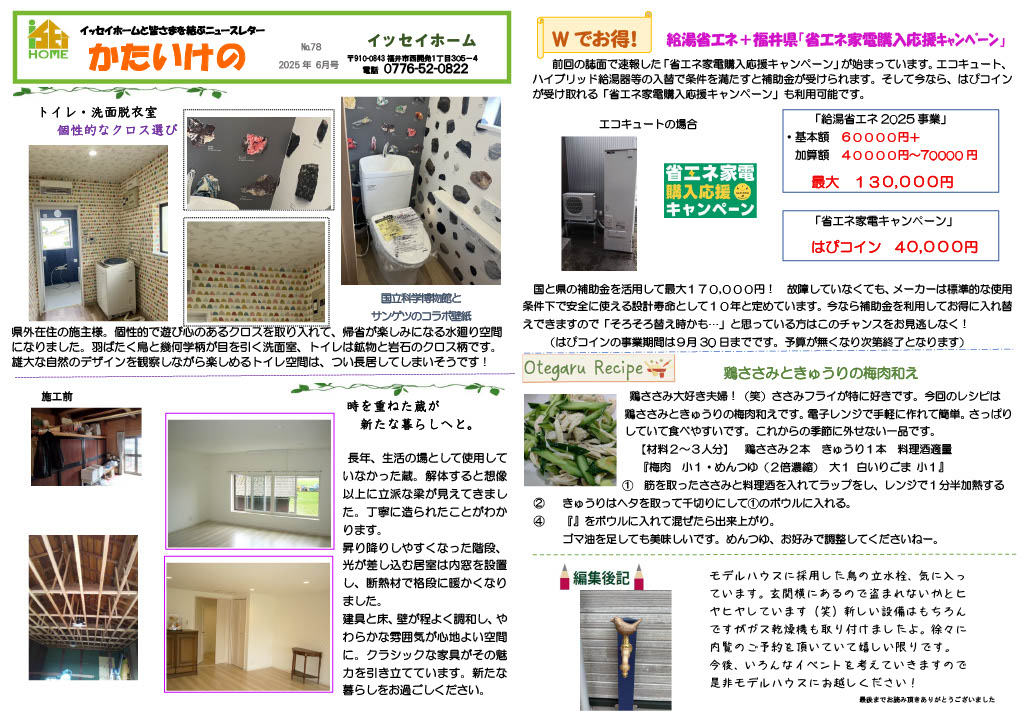 - ニュースレターは2ヶ月に1度、イッセイホームの施工情報・お得情報・最新のリフォーム情報など、もりだくさんに発行しています。
