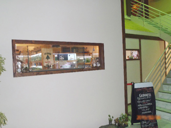 | ここから2階のカフェバーへと行くことができます。 | 立派なアクアリウムです。壁の一部を抜くことで外からも見ることができるようにしました。 |