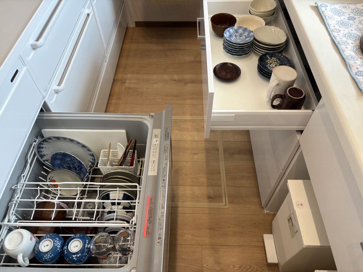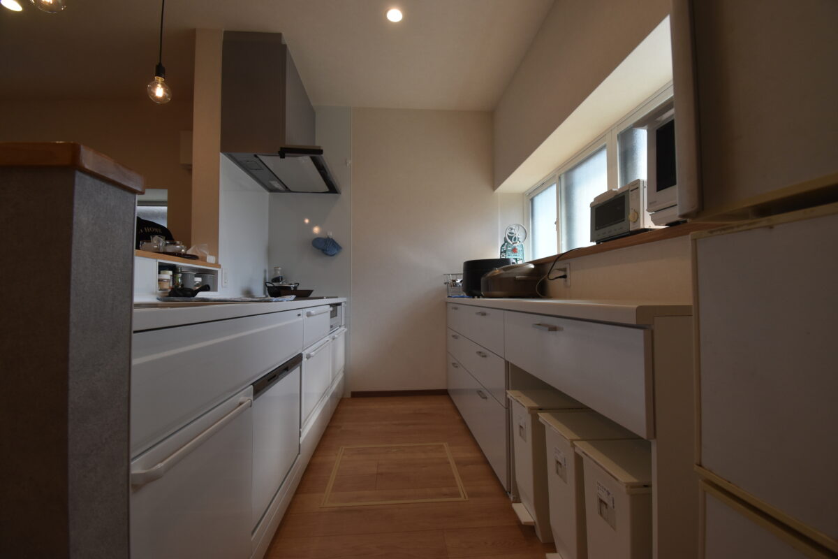 キッチン収納は、コスト面を考慮して別メーカーのカップボードをご提案。使いやすさとデザインを確認され、採用を決められました。腰壁にスパイスラックを設置して使いやすくします。